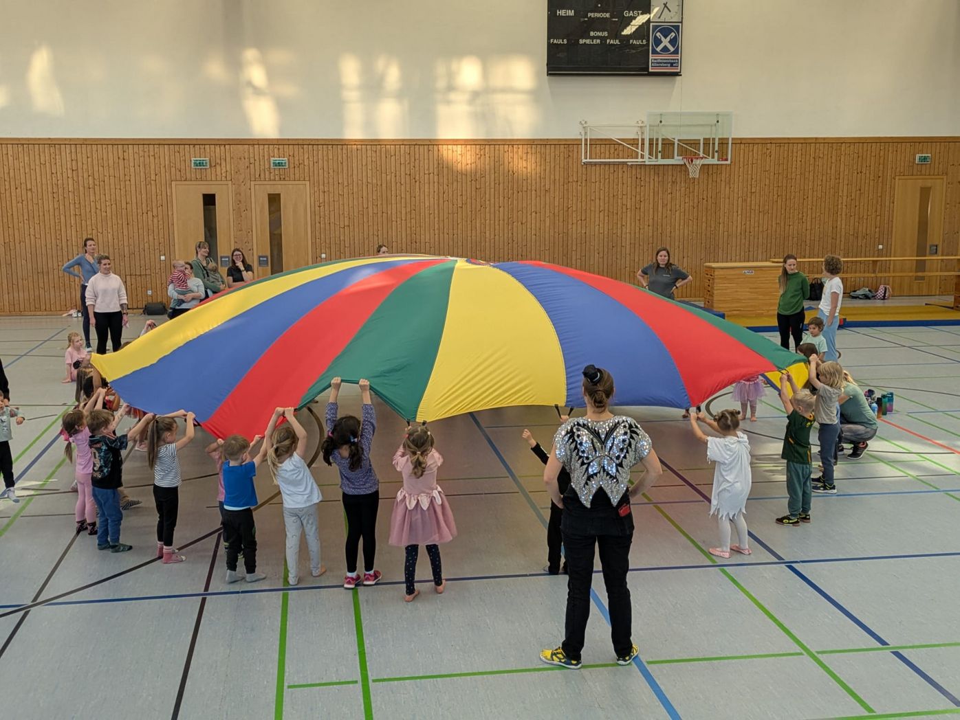Gerade die Kleinsten lassen sich von einer positiven Bewegungsaktivität ihrer Eltern begeistern, so dass in dieser Stunde die Mamis und Papis aktiv in die Stunde mit einbezogen werden.